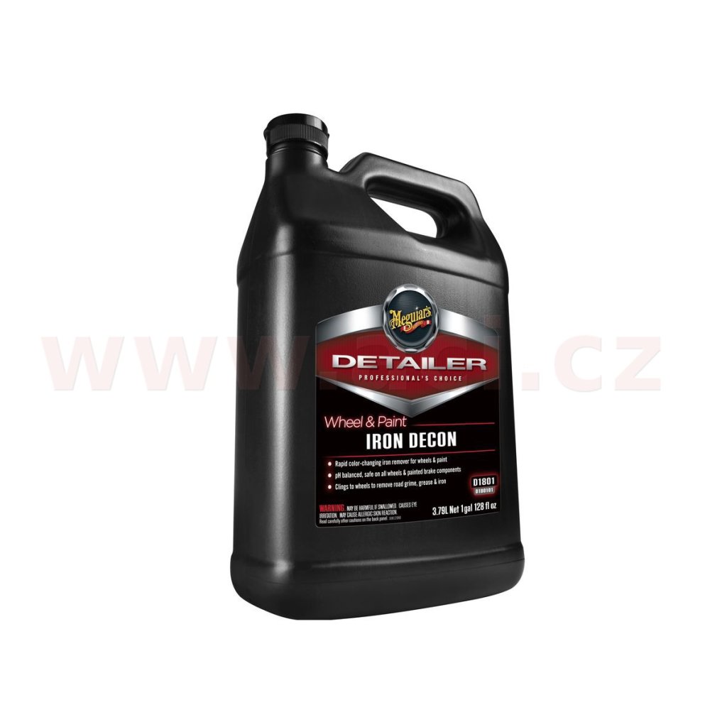 Meguiar's Professional Wheel & Paint IRON DECON obsahuje příměsi, které při kontaktu s nečistotami na bázi železa (Fe) zbarví přípravek do ruda. Tento efekt není důkazem čisticího účinku produktu, ale pouze indikátorem, zda nečistoty na povrchu obsahují železo. Pokud jsou povrchy silně znečištěny, avšak bez obsahu železitých nečistot, přípravek se nezbarví, ale stále bude stejně výborně čistit povrch od všech zbytků nečistot.