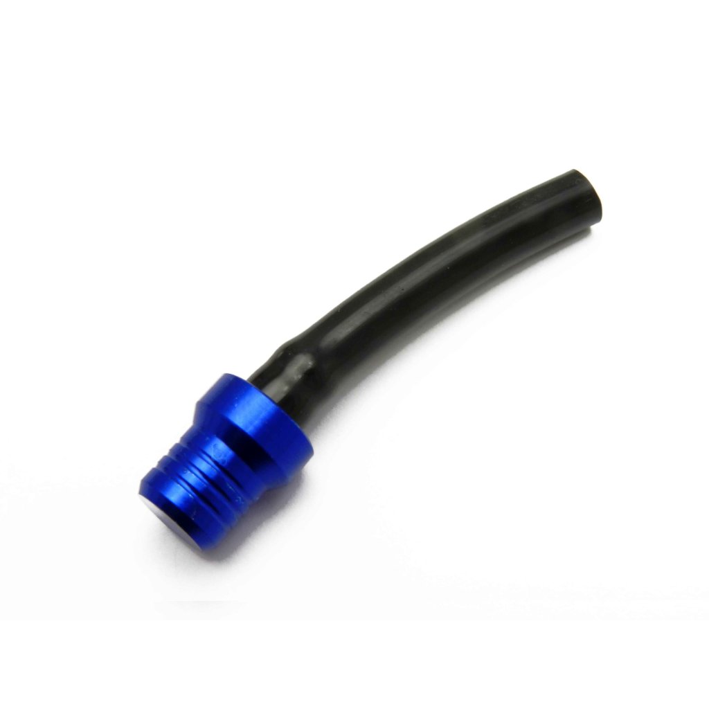 pitbike Tomanon; bezpečnostní odvzdušňovací ventilek víčka palivové nádrže, barva modrá, CNC provedení, celková délka 75mm, vnitřní průměr hadičky 5mm, odvzdušňovací ventilek s gumovou hadičkou