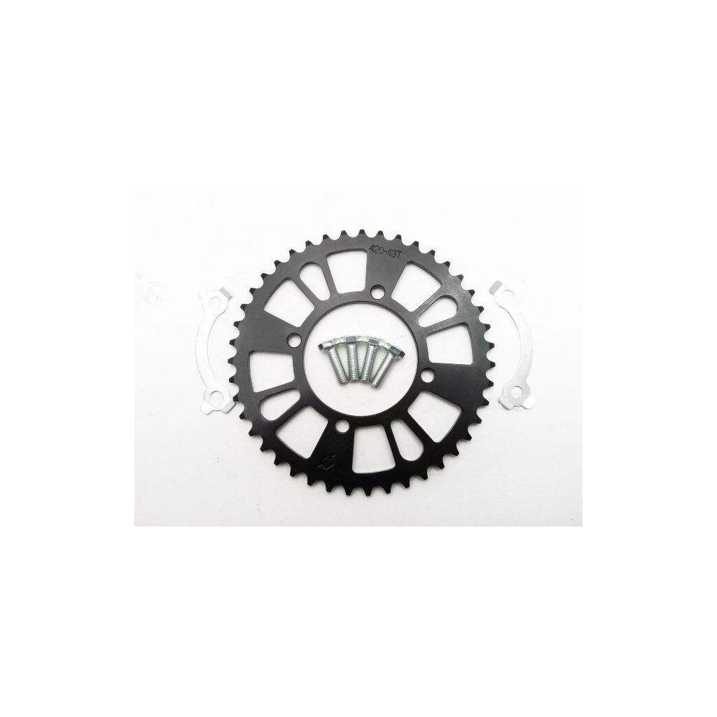 originální pitbike Tomanon; rozeta na řetěz 420, 43 zubů, středová díra 76mm, rozteč šroubů 93mm(do kříže), součástí balení jsou 4ks šroubů se zajištovacími plíšky, materiál: železo