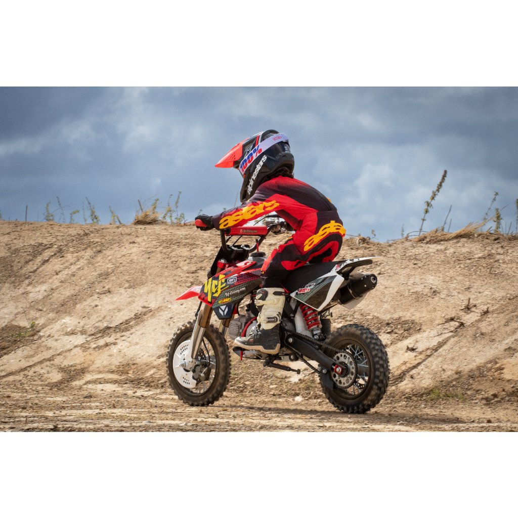 Dětský juniorský pitbike velikostí vhodný pro cca 8leté děti. Naučí se na ní děti ale zvládnou se učit i dospělý. Výhodou je elektrický startér na motoru 88ccm. Malý stroj s nízkou váhou a dobrou ovladatelností pro naučení základů na motorce ve vývoji dětí na motorkách v terénu. Pro začátečníky je super že má poloautomatickou převodovku.