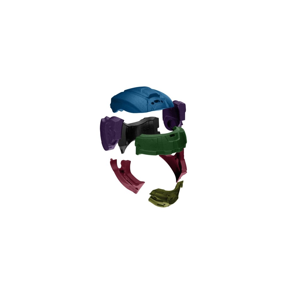 - Vnitřní absorpční jádro je tvořeno z 8-mi panelů EPS polystyrenu s 6-ti různými hustotami materiálu tak, aby přilba cíleně poskytla různé absorpční nárazové vlastnosti na místech, kde je potřeba.