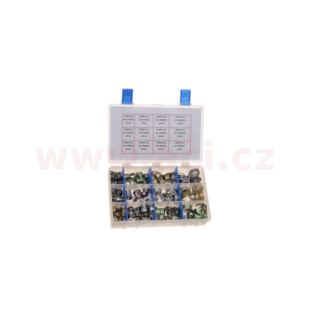 Tento box obsahuje 12 nejpoužívanějších rozměrů bezšroubých jednodílných hadicových spon Cobra, dohromady 150 ks.