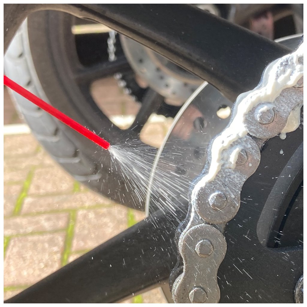 - 2. Důkladně protřepejte nádobku a naneste přípravek na celou vnitřní délku řetězu, přičemž pomalu otáčejte kolem. K otáčení kola nepoužívejte motor.